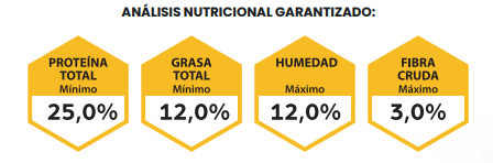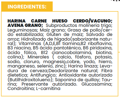 Tiene 25% de proteína, primer Ingrediente carne, segundo avena, ademas incluye glucosamina, condroitina y L-carnitina.
