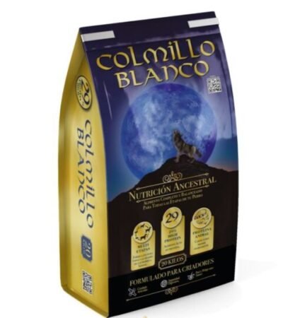 Alimento premium Colmillo Blanco para perros de todas las edades. Elaborado con ingredientes puros de la más alta calidad. Con un 29% de proteínas, vitaminas, minerales, DHA omega-3 y EPA para cubrir todas las necesidades nutricionales de tu mascota, propias desde sus orígenes ancestrales. Fundamental para mantener a tu perro sano y vigoroso.