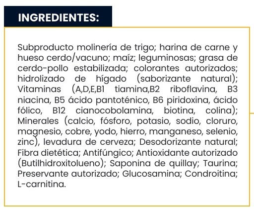 Este alimento contribuye al desarrollo y mantenimiento de una musculatura firme, favorece una digestión eficiente y apoya un sistema inmunológico fuerte. Además, incorpora nutrientes que ayudan al cuidado de la piel y promueven un pelaje sano y brillante, con proteínas y energía para una musculatura fuerte, Vitaminas y minerales que fortalecen el sistema inmune, ayuda a una piel sana y un pelaje brillante.