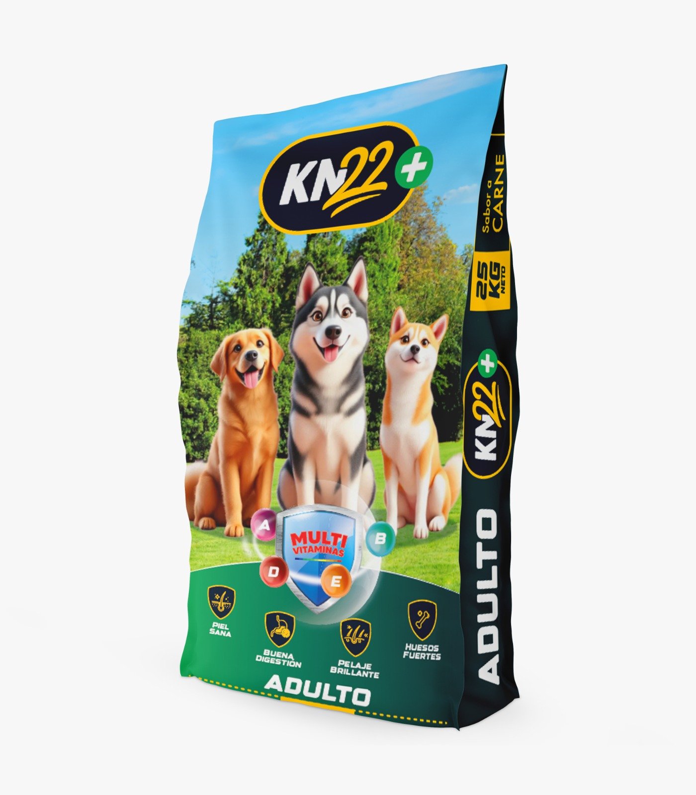 KN22. un alimento para perros adultos de todas las razas, en formato de 25kg. Su fórmula combina 22% de proteínas de calidad, carbohidratos de fácil digestión y un completo mix de vitaminas y minerales, ayudando a mantener a tu perro activo, saludable y en óptima condición corporal.